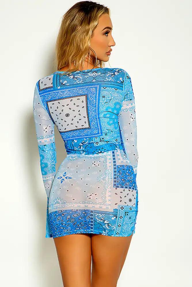 Blue White Paisley Print Long Sleeve Mesh Ruched Dress