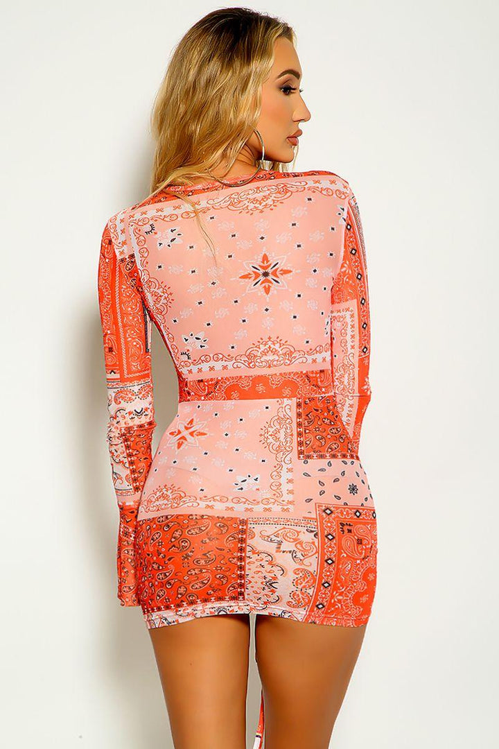 Orange White Paisley Print Long Sleeve Mesh Ruched Dress