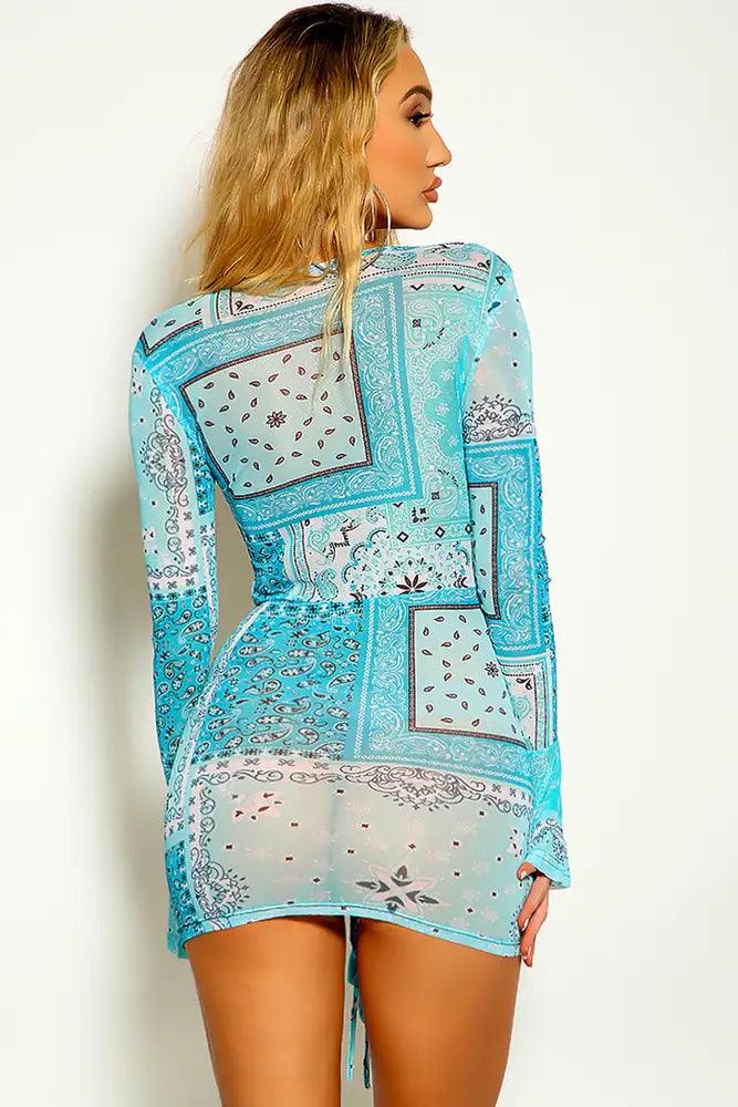 Teal White Paisley Print Long Sleeve Mesh Ruched Dress