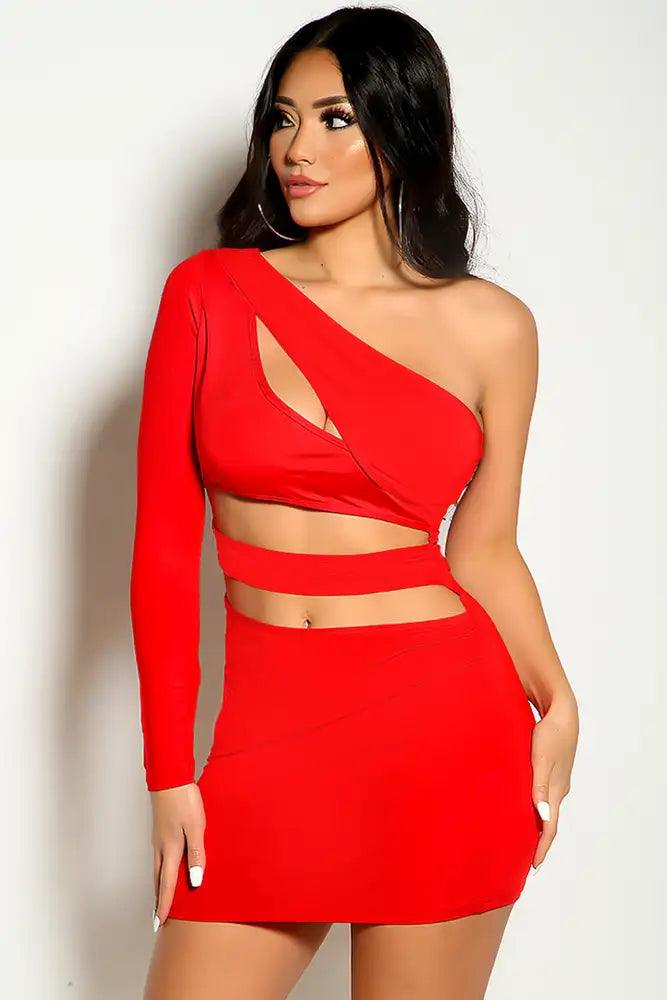 Red Long Sleeve One Shoulder Cut Out Party Dress