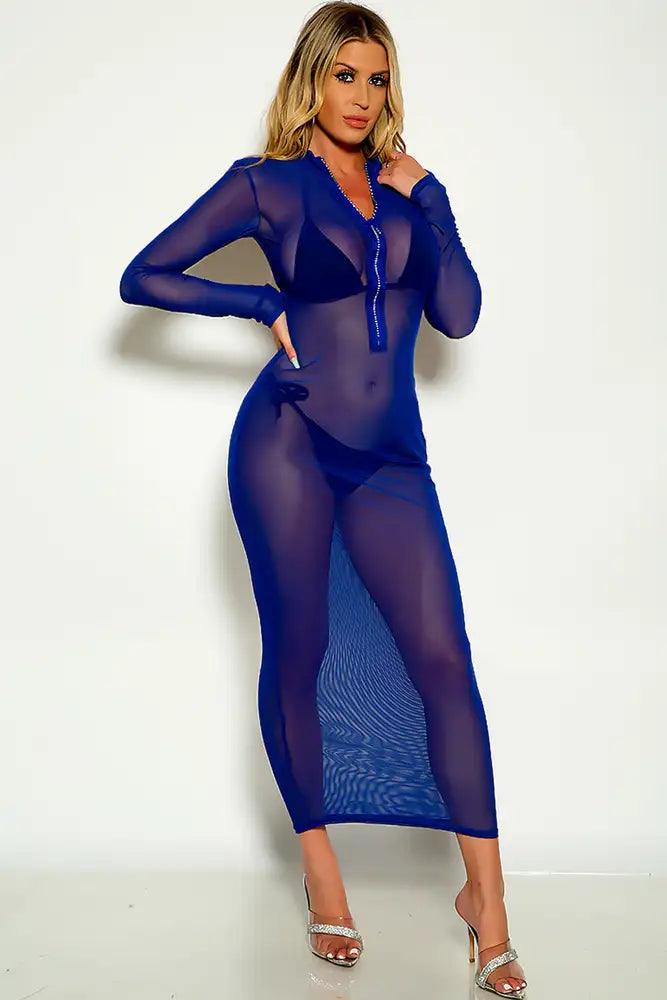 Blue Long Sleeve Mock Neck Mesh Rhinestone Detail Maxi Dress