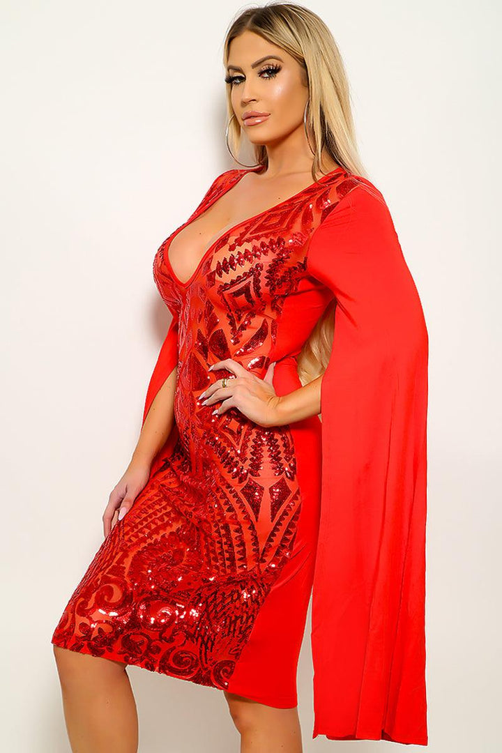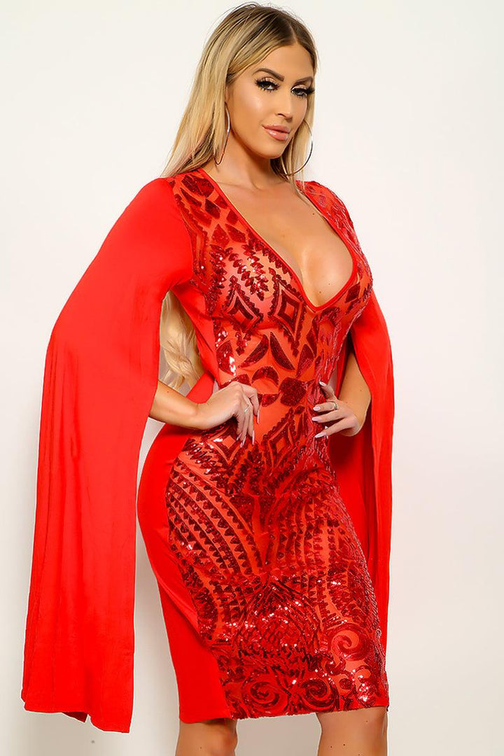 Red Sequin Mesh V-Neck Cape Sleeve Sexy Party Dress
