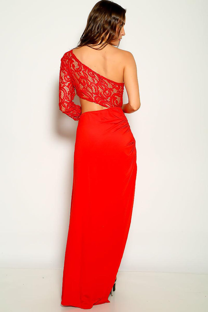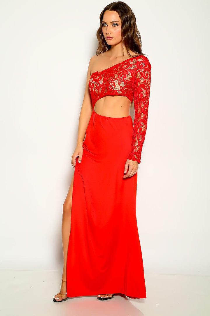 Red Lace Asymmetrical Thigh High Slit Maxi Party Dress
