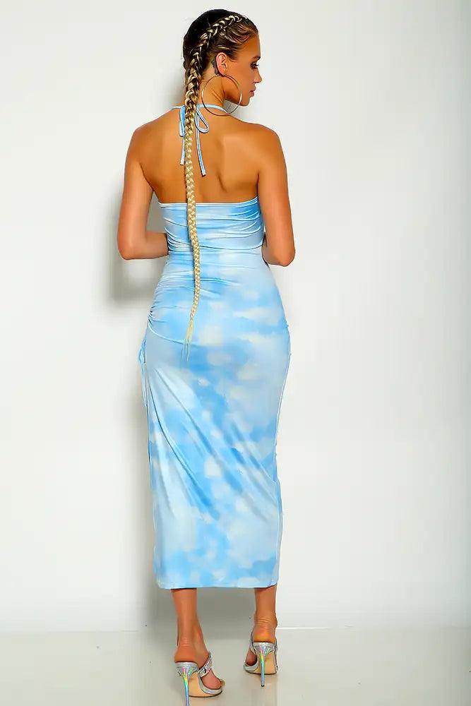 This dress will make a statement! Featuring; halter, scooped neckline, tie dye, adjustable ruched detail. Followed by a fitted wear. 90% polyester 10% spandex