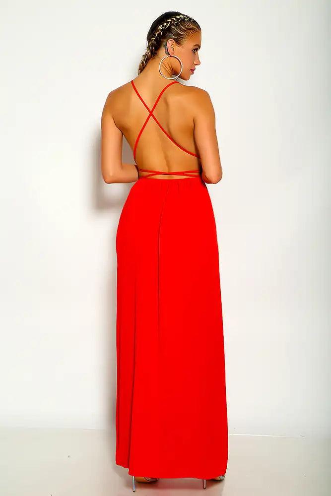 Red Sleeveless V-Cut Belted Maxi Party Dress