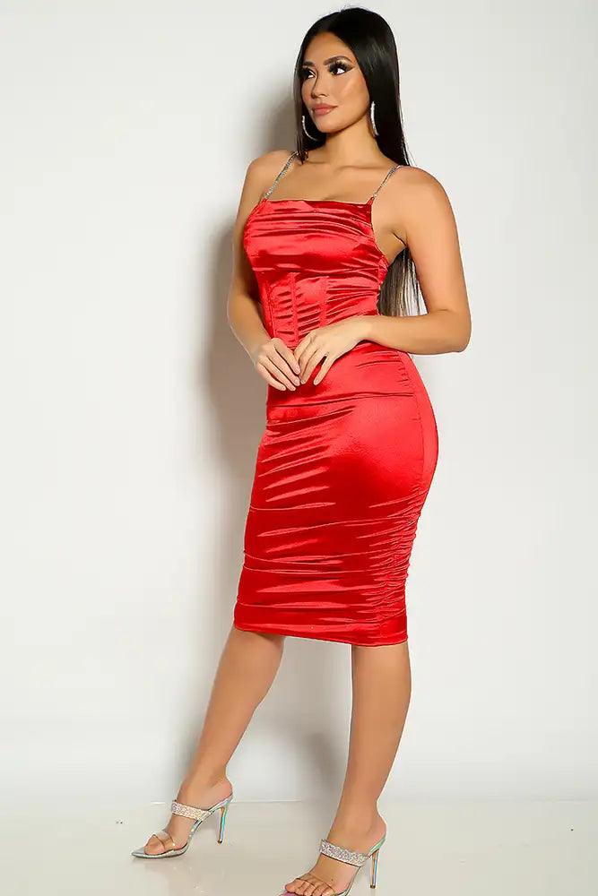 Red Sleeveless Boned Faux Satin Ruched Party Dress