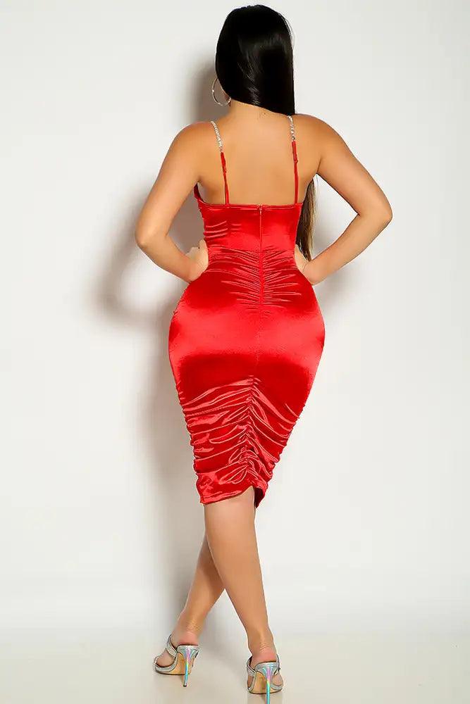 Show Off your curves in this faux satin dress. Featuring; sleeveless, rhinestone straps, boned detail, side ruched, back zipper closure. Followed by a fitted wear