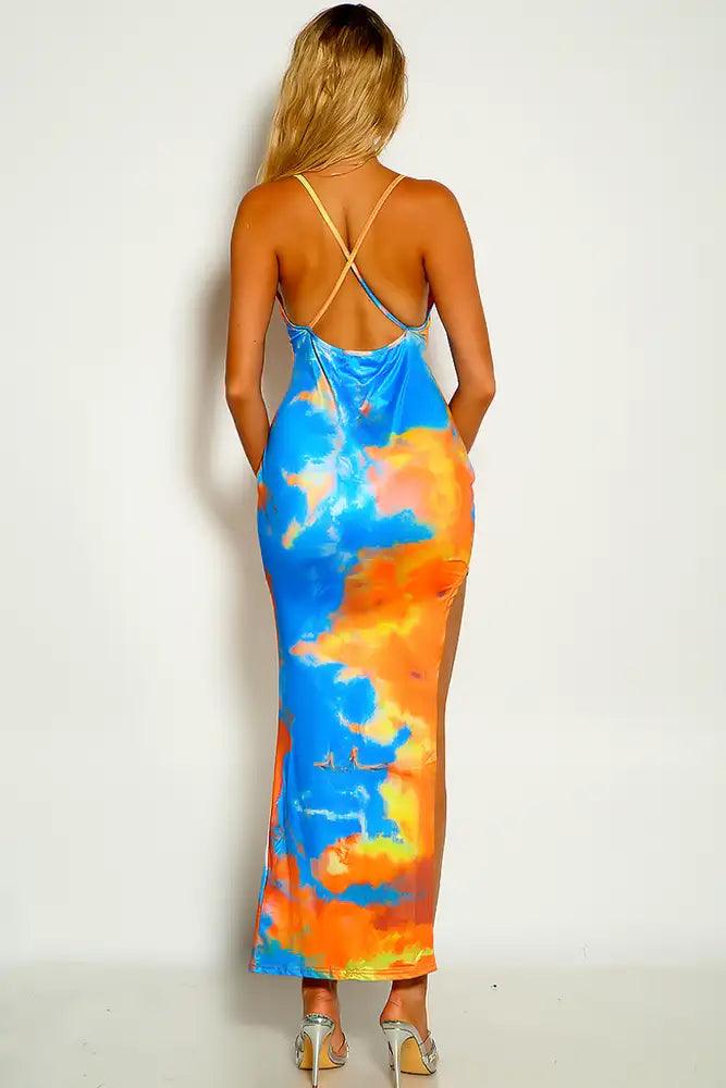 Orange Blue Sleeveless Two Tone Side Slit Maxi Dress