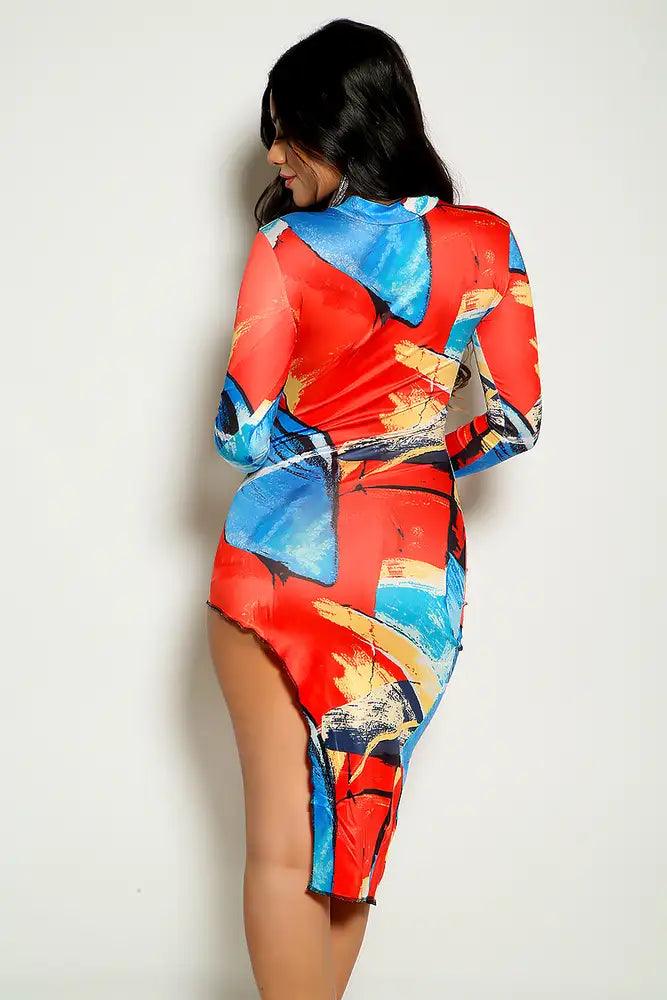 This dress will make you feel fabulous on a nigh out! Featuring; Long sleeve, mock neck line, two tone, abstract, high low dress. Followed bya fitted wear
