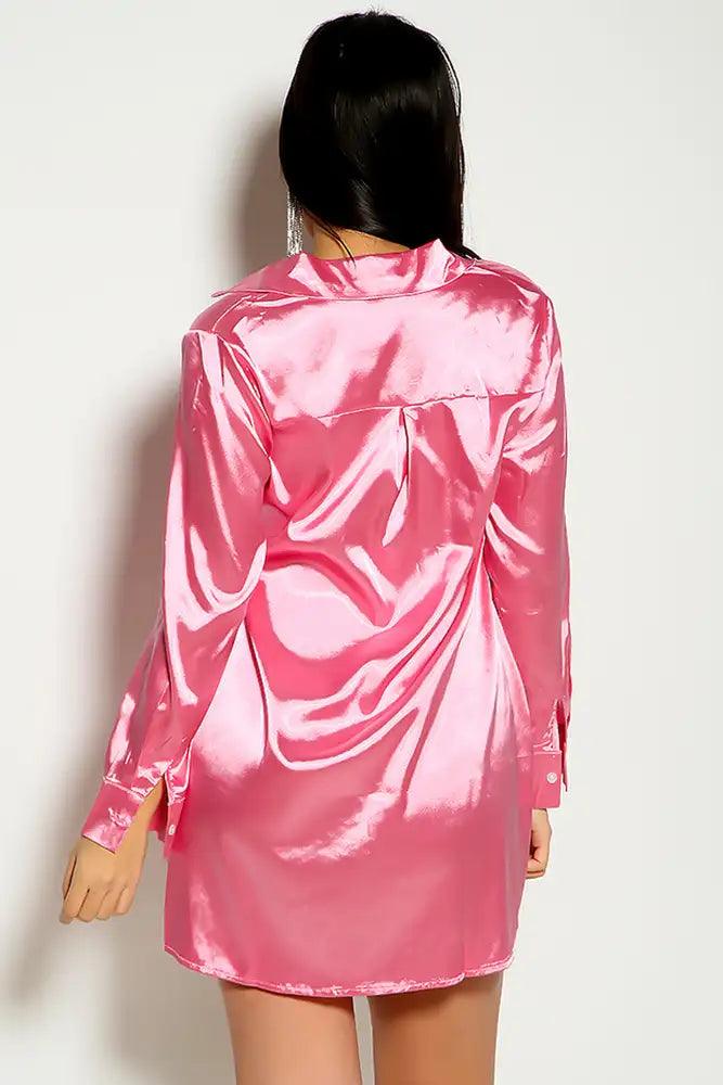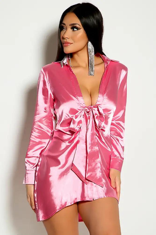 Pink Long Sleeve Faux Satin Button Up Tie Detail Shirt Dress