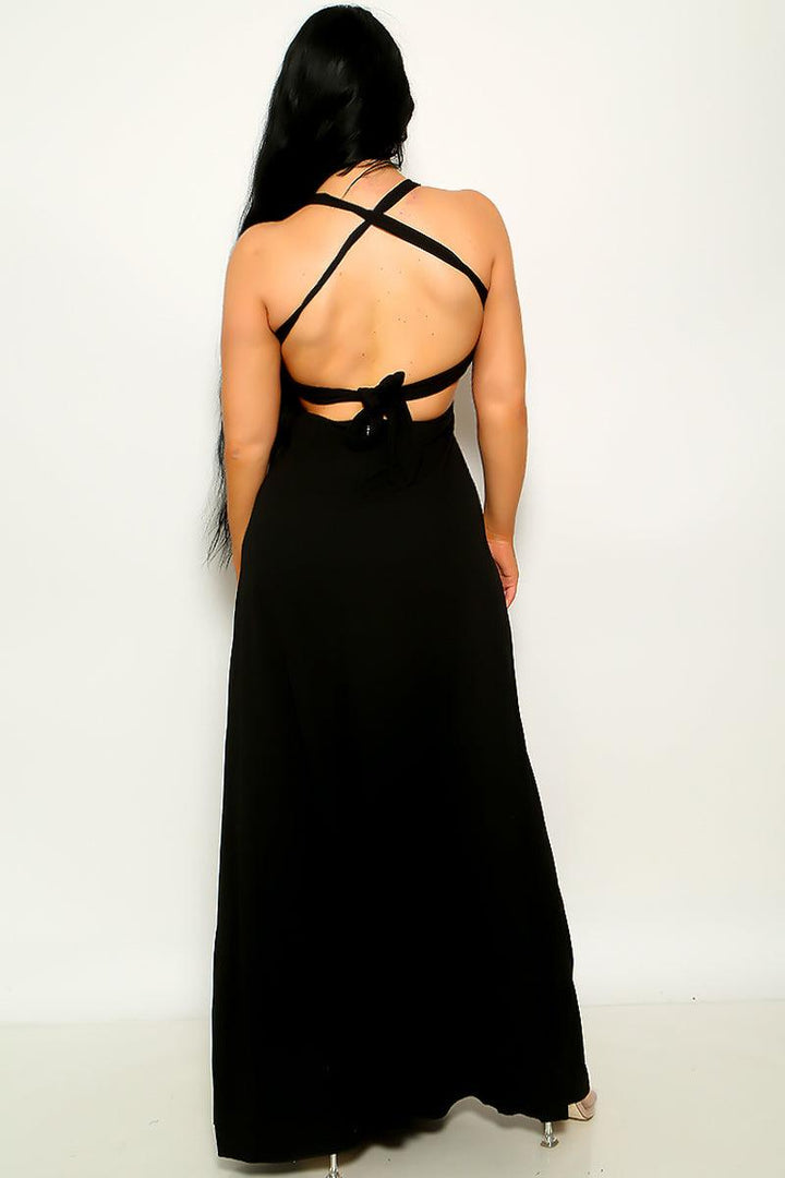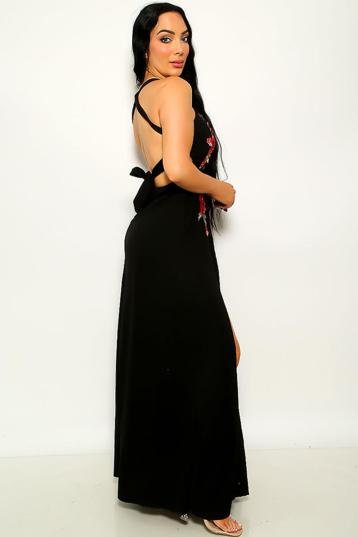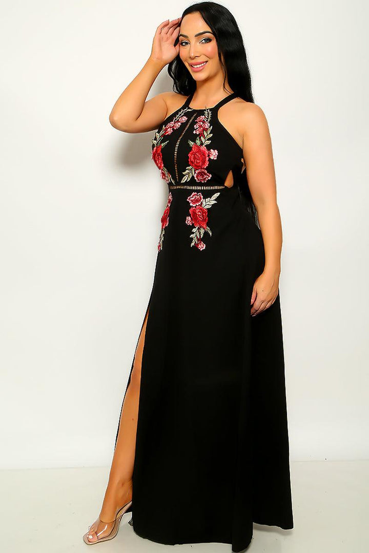 Black Floral Embroidery Slit Maxi Party Dress