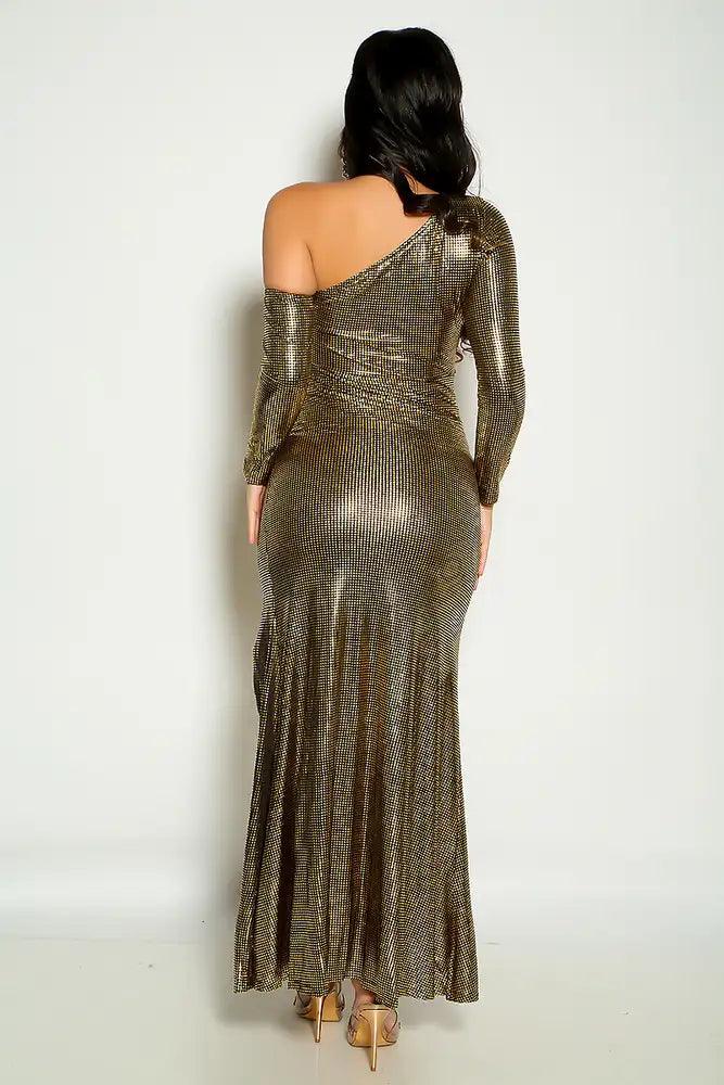 Black Gold Dotted Metallic One Shoulder Long Sleeve Cocktail Maxi Dress