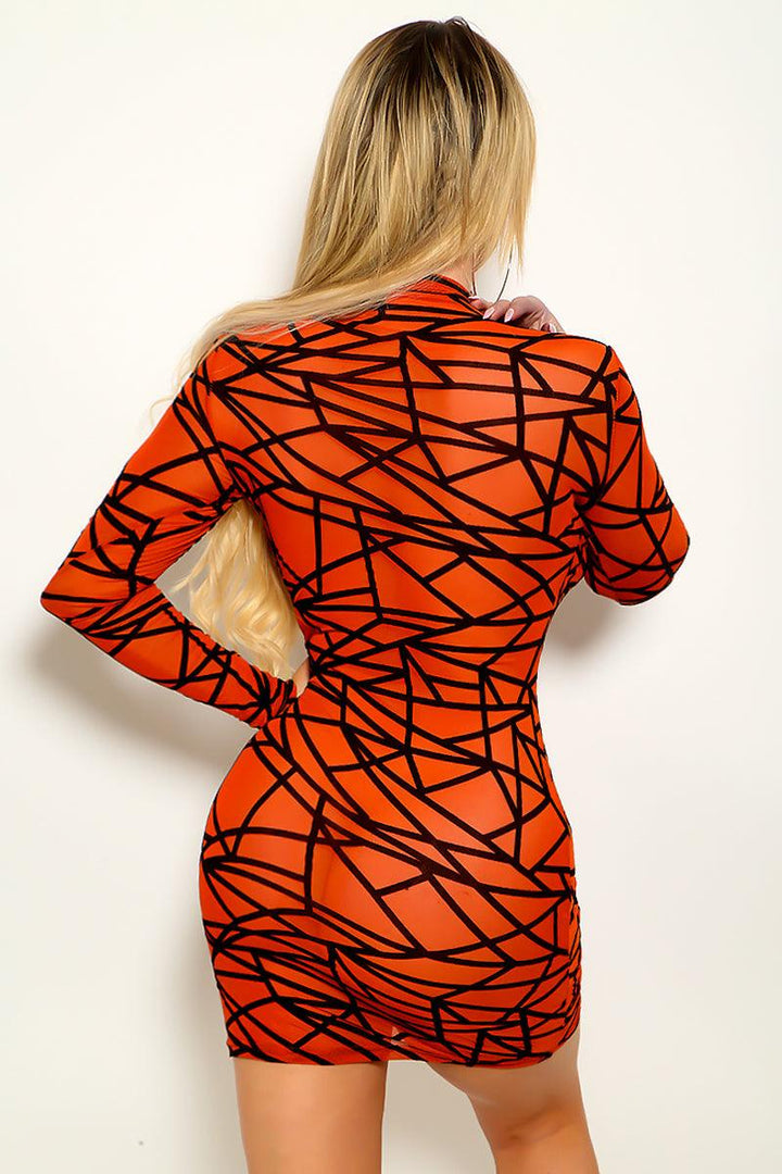 Rust Black Sexy Mesh Long Sleeve Mini Party Dress