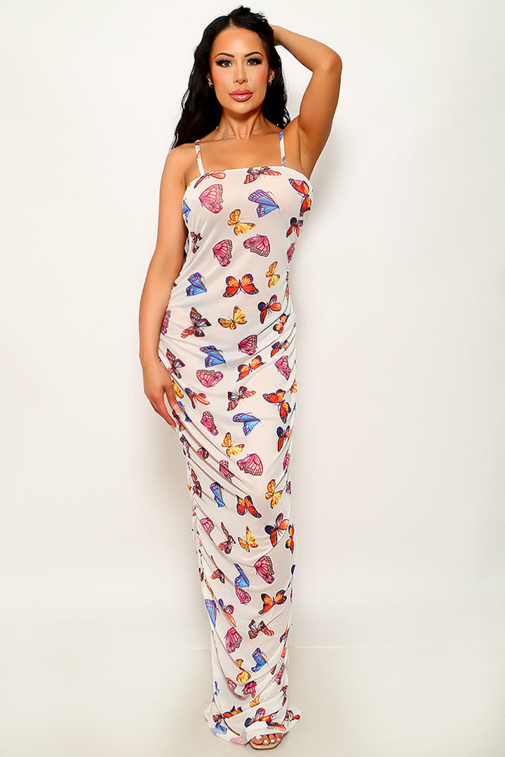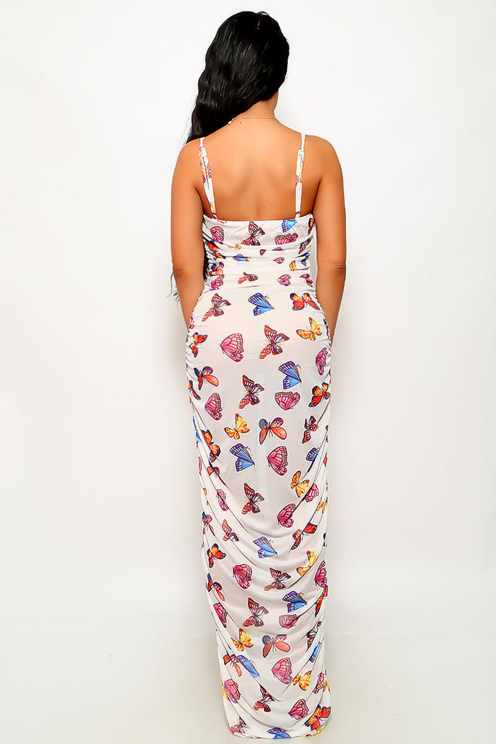 Unleash your wild and playful side in our White Butterfly Print Mesh Ruched Sexy Maxi Vacation Party Dress. Embrace your inner butterfly with this unique, eye-catching design. Perfect for any vacation or party, this dress will make you the center of attention. Get ready to spread your wings and fly!