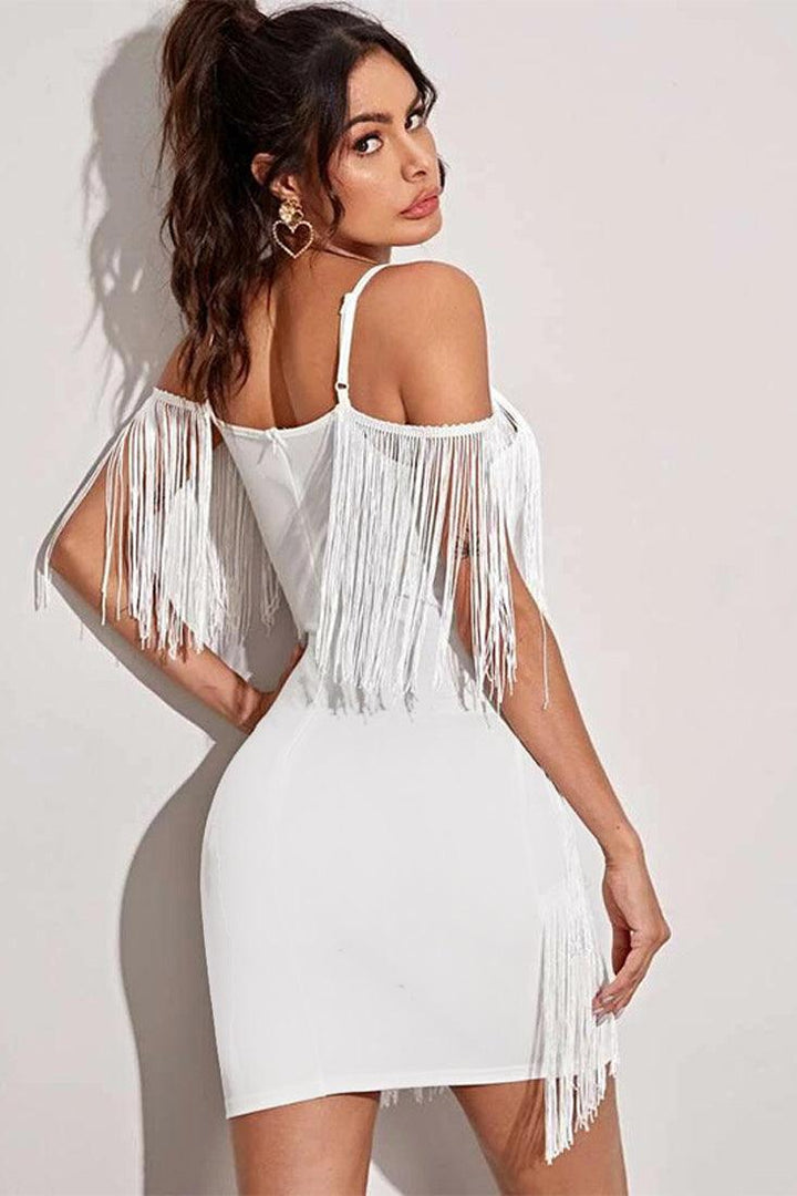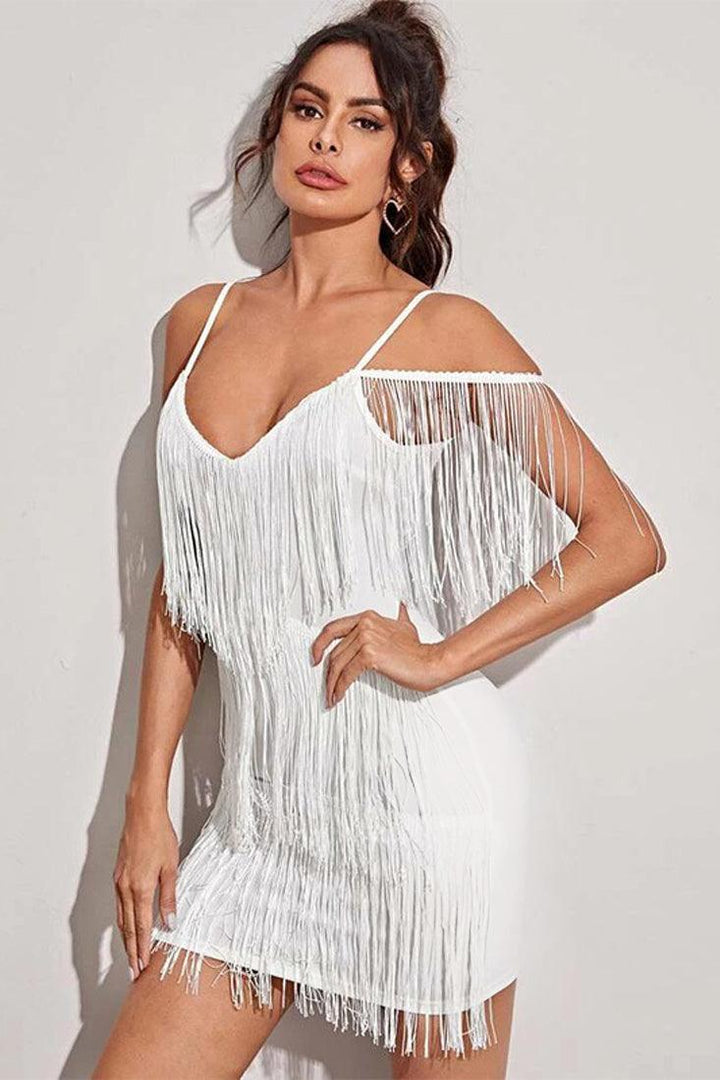 This sexy dress is perfect for a night out. Featuring; sleeveless, v cut, adjustable straps, fringe. Followed by a fitted wear. 90% Polyester 10% Spandex