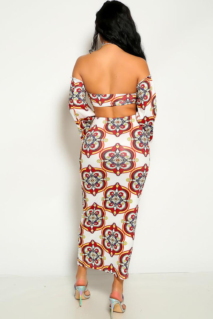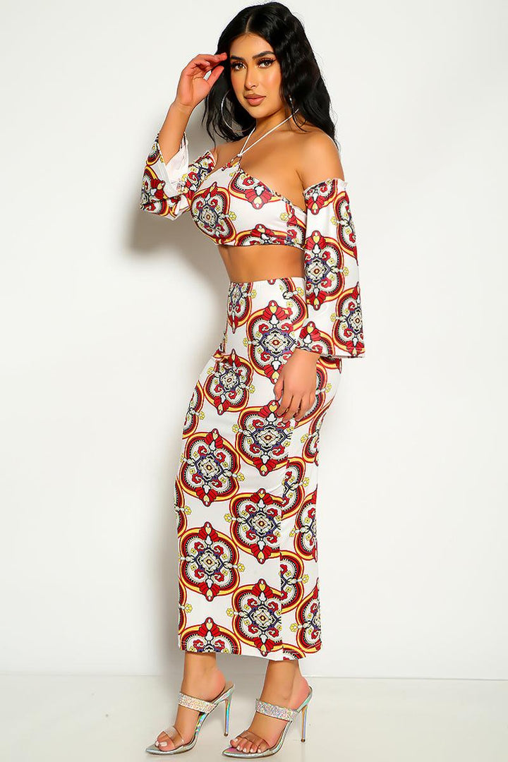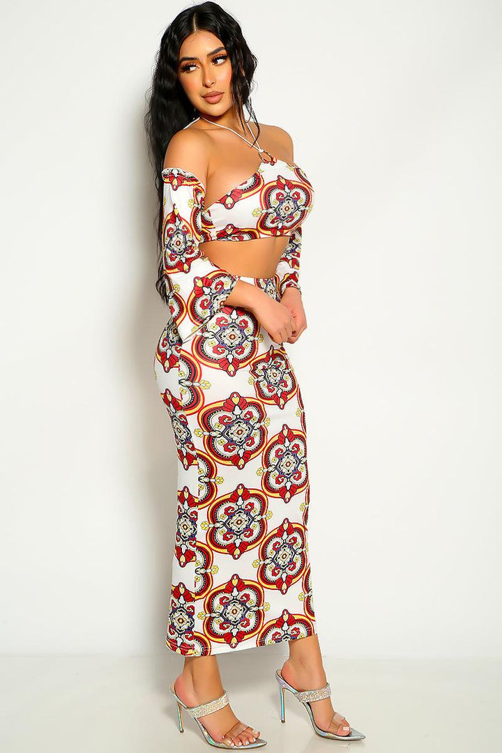 Pair your favorite heels with this two piece dress! Featuring; long sleeve, two-tone, o-ring detail, halter, crop top, graphic print, matching skirt. Followed by a fitted wear. 90% polyester 10% spandex.