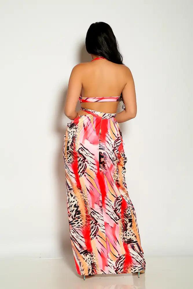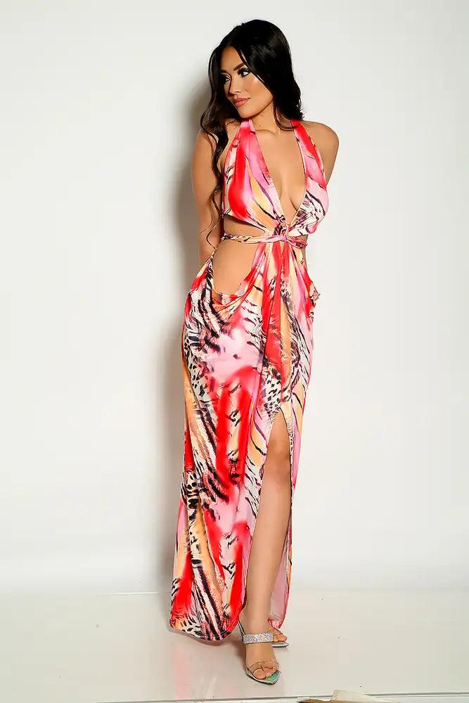 Feel fabulous in this dress Featuring; halter, sleeveless, two tone, scooped neckline, cut out, front slit. Followed by flowy wear
