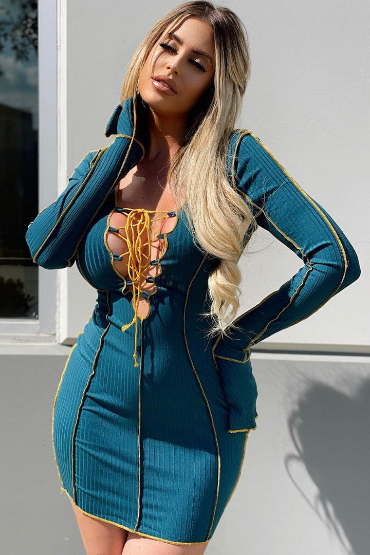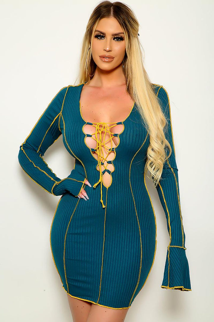 Sexy Teal Lace Up Flared Sleeves Ribbed Party Dress