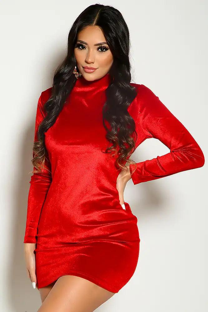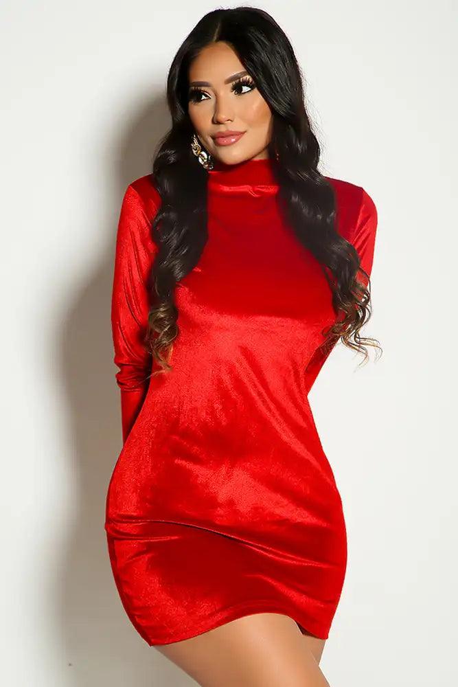 Red Long Sleeve Mock Neck Velvet Party Dress