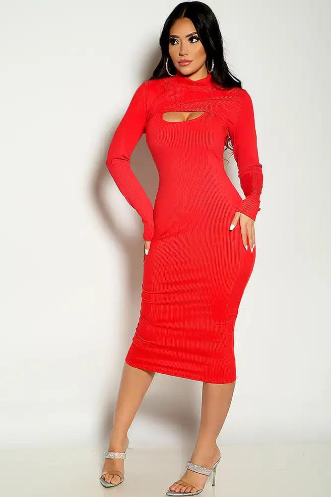 Red Long Sleeve Cropped Two Piece Ribbed Midi Party Dress