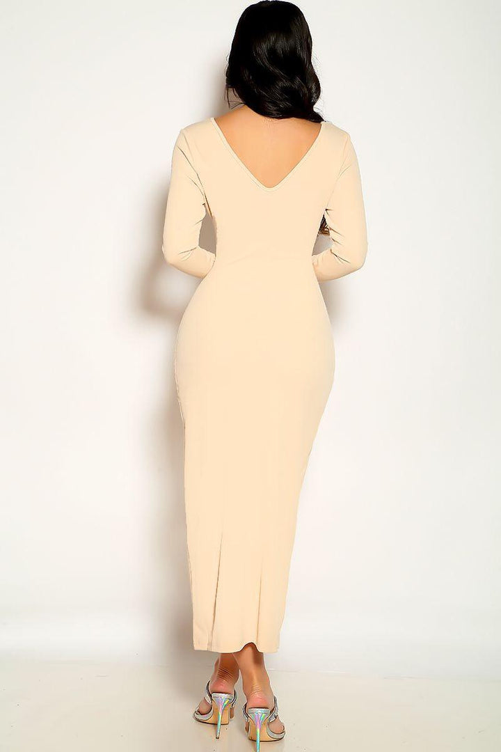 Beige Long Sleeve Ribbed Midi Casual Dress