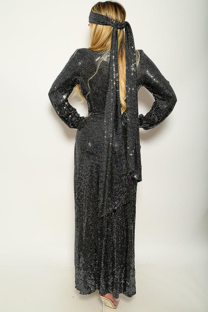 Sparkle into the night wearing this show stopping dress! Featuring; long sleeves, v-cut neckline, padded shoulders, small silver disc detail, maxi length from the back, matching scarf/belt, followed by a fitted wear. Stretch Fit.
