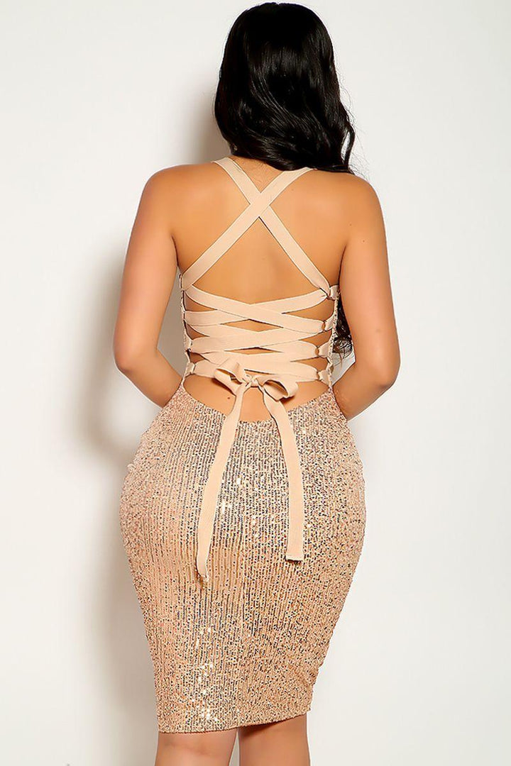 Show off your curves in this sexy dress! Featuring; sleeveless, scooped neckline, sequins, back lace up, knee length dress!