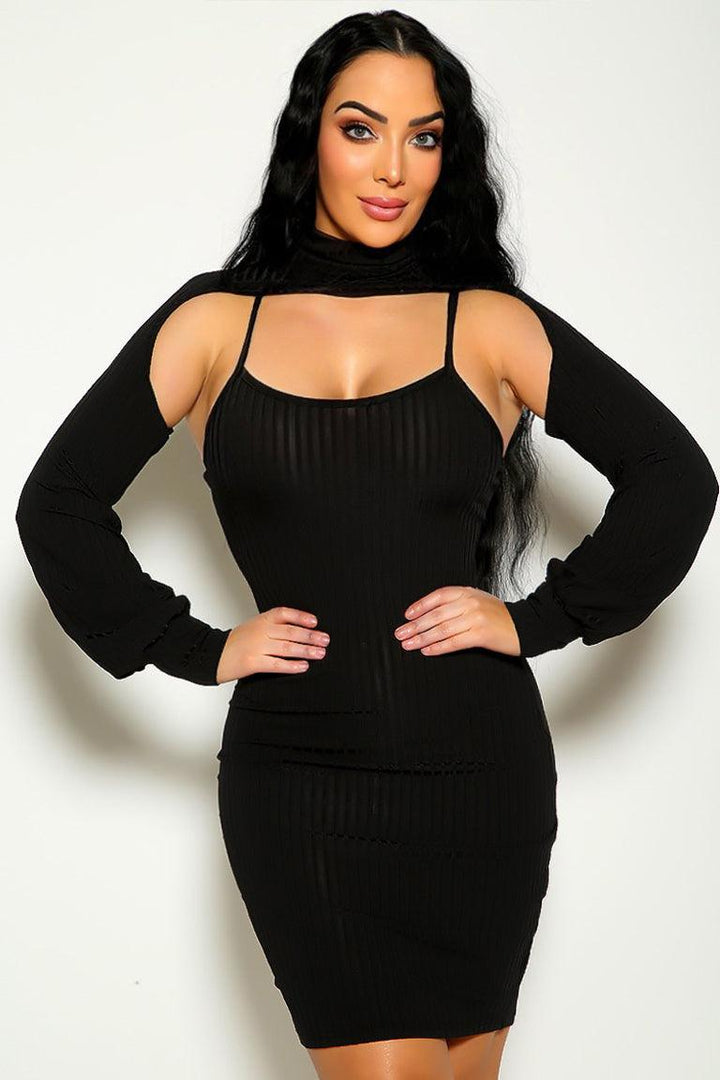 Black Solid Turtleneck Shawl Long Sleeve 2 Pc Dress