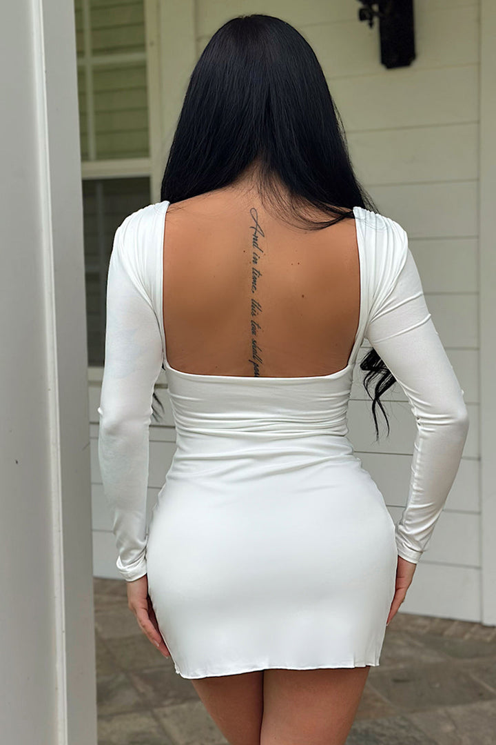 White V-Neck Long Sleeves Open Back Shoulder Pad Sexy Mini Party Dress