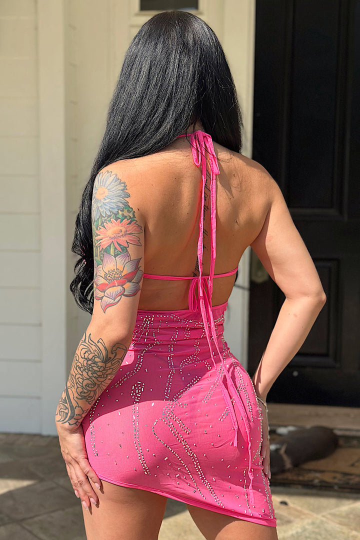 Rock the party in our Pink Rhinestone Mesh Strappy Cut-Out Asymmetrical Sexy Dress. With stunning rhinestone mesh, strappy detailing, and a playful asymmetrical cut, this dress will have you standing out from the crowd. Get ready for a night of fun and compliments