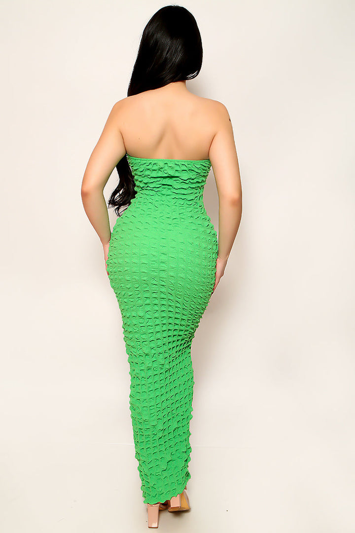 Get ready to turn heads in this Green Textured Fabric Strapless Knot Sexy Fitted Maxi Dress! The vibrant green color and textured fabric will make you stand out, while the strapless design and knot detail add a touch of sexiness. With a fitted silhouette, this dress will hug your curves in all the right places. Perfect for a night out or a special occasion, this dress is a must-have in your wardrobe!
