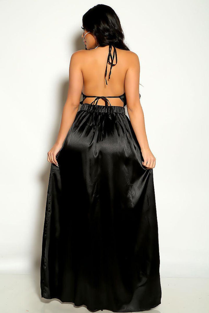 Black Halter Double Slit Satin Sexy Maxi Dress