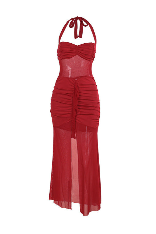 Indulge in a playful and sexy look with this red ruched mesh waist skirt high slit maxi party dress. The mesh waist adds a touch of allure while the high slit adds a dash of edge. Perfect for any party or special occasion.