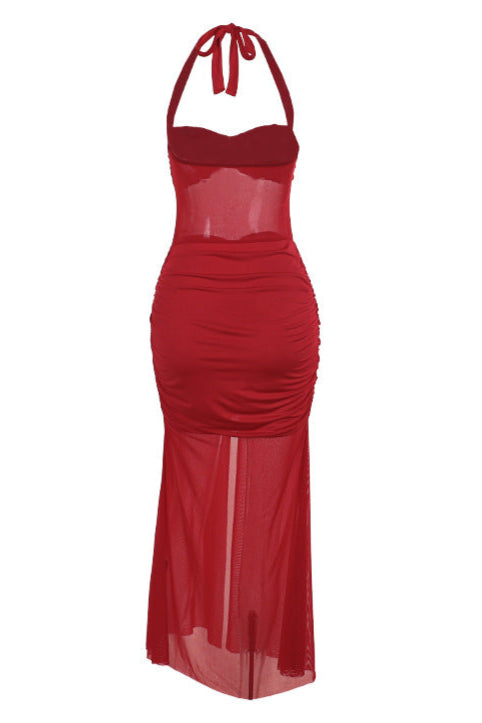 Indulge in a playful and sexy look with this red ruched mesh waist skirt high slit maxi party dress. The mesh waist adds a touch of allure while the high slit adds a dash of edge. Perfect for any party or special occasion.