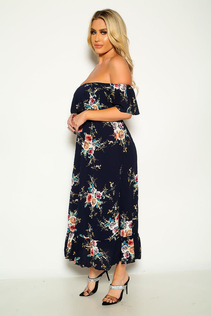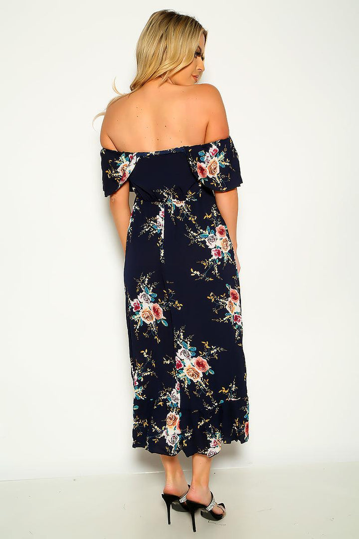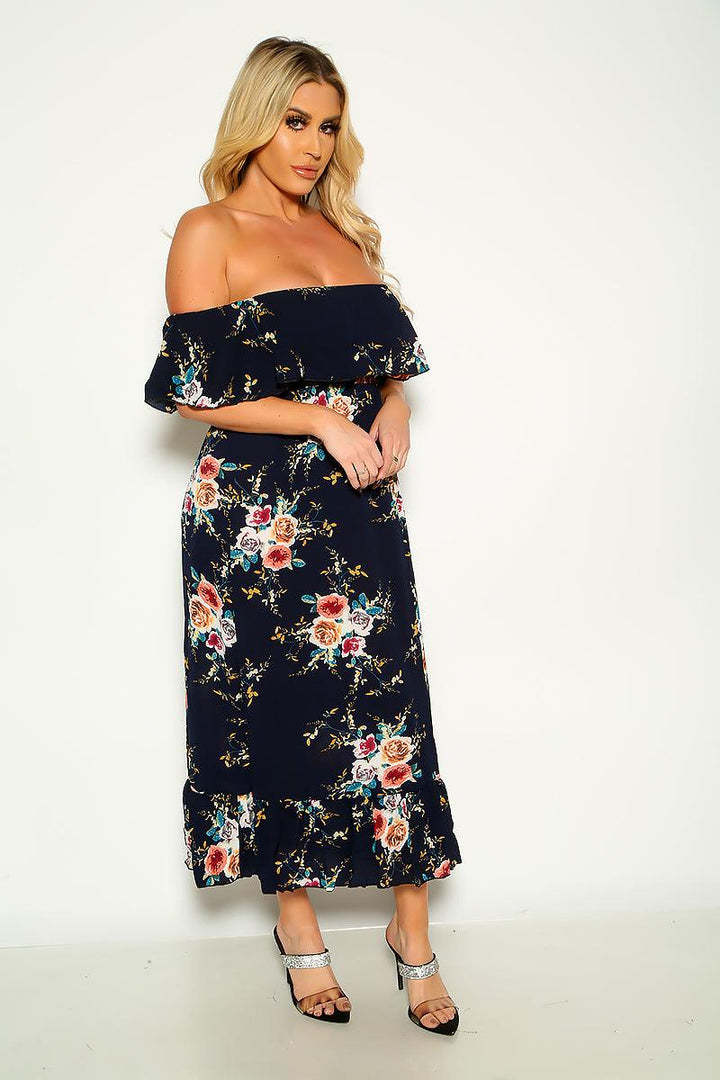 Navy Floral Ruffled Trim Off Shoulder Sexy Party Dress