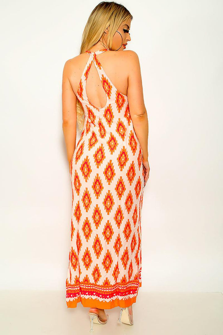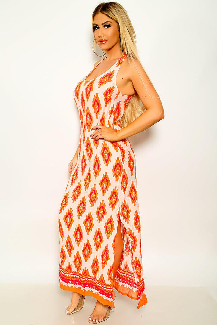 Slay in style in this sexy party dress! Featuring; sleeveless, scooped neckline, criss-cross back, peach/salmon graphic design, side slit, maxi length, followed by a fitted wear. Non Stretch.