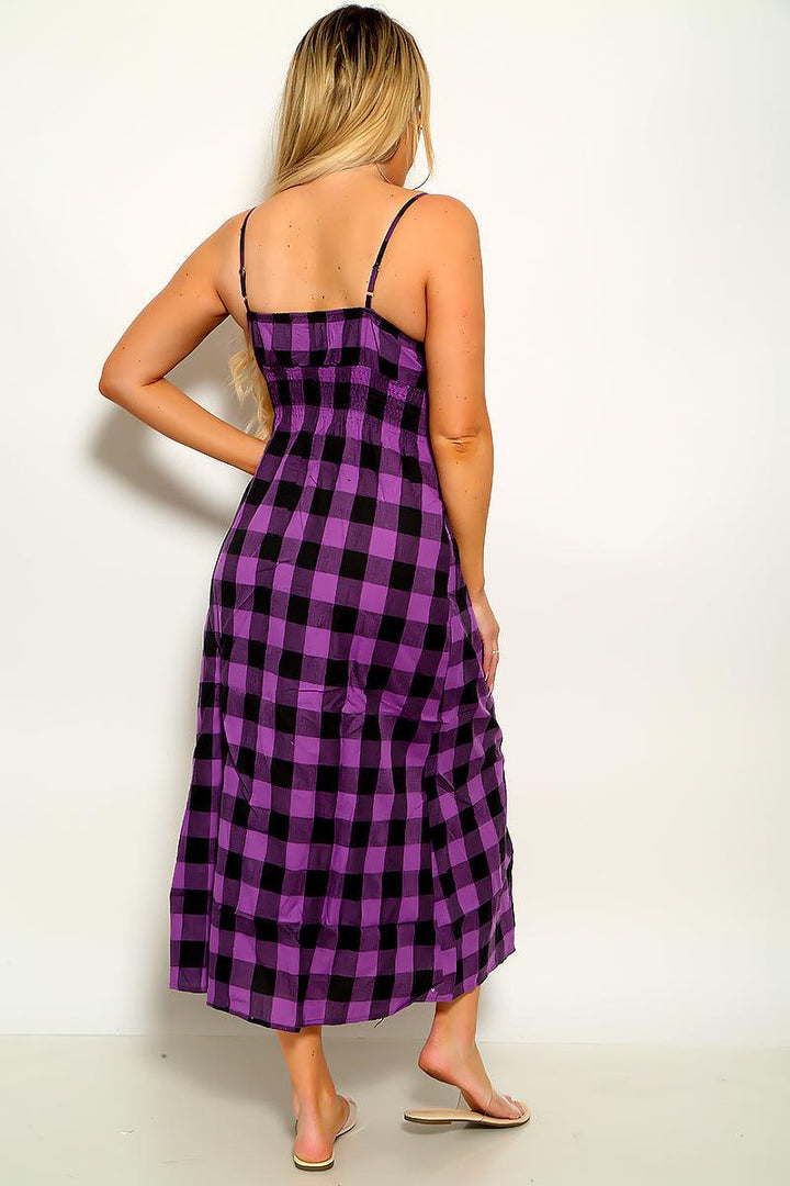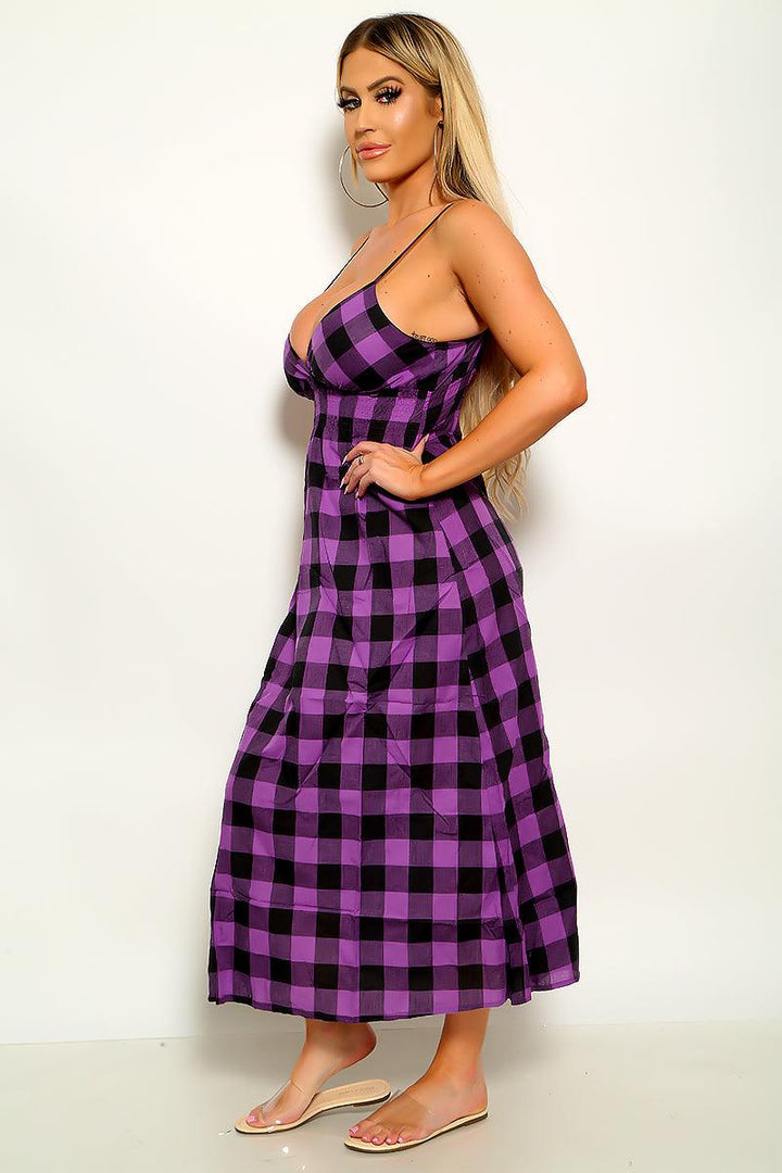 Team up this dress with our sexy heels! Featuring; sleeveless, adjustable straps, maxi length, purple/black plaid design, followed by a fitted wear. Non Stretch.