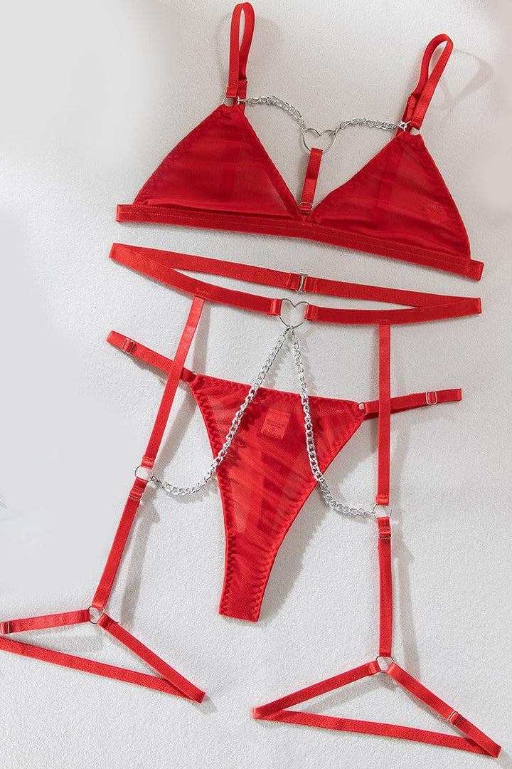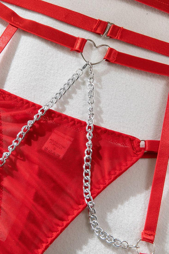 Red Mesh Sheer Strappy Heart Ring Chain Garter Thong 3Pc Sexy Lingerie Set