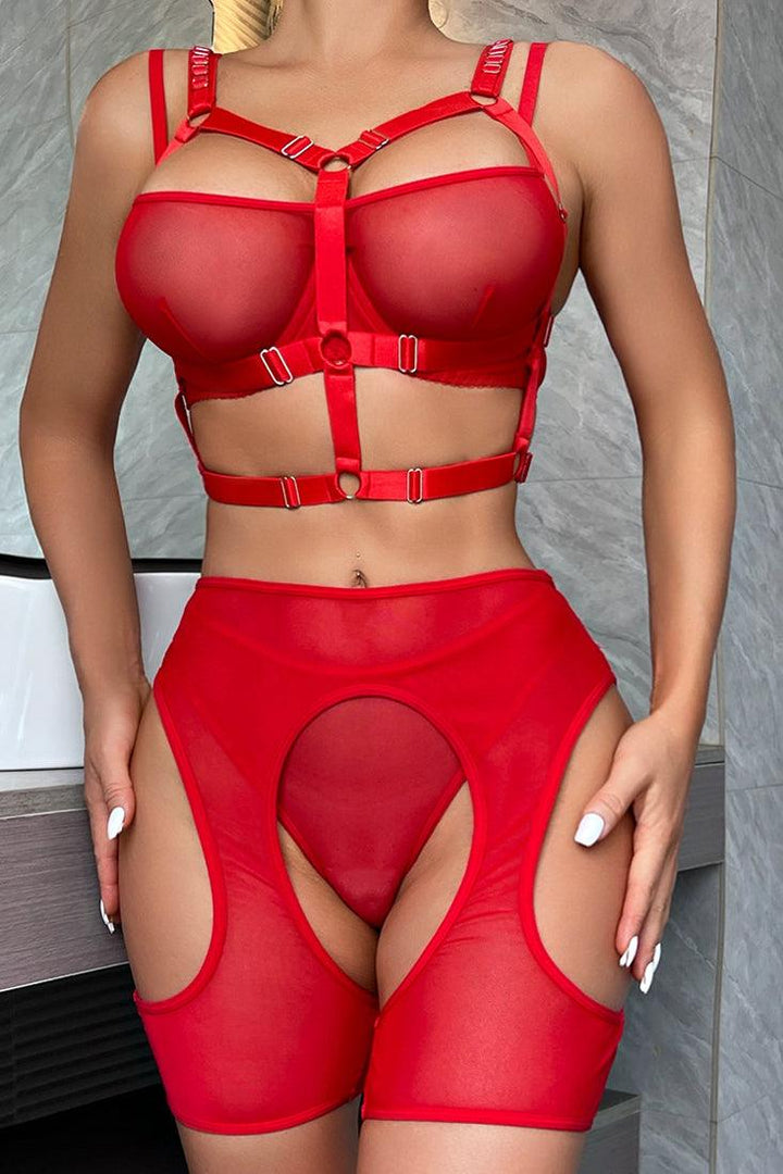 Red Sheer Mesh High Waisted Garter Cut Open Shorts 4Pc Lingerie Set
