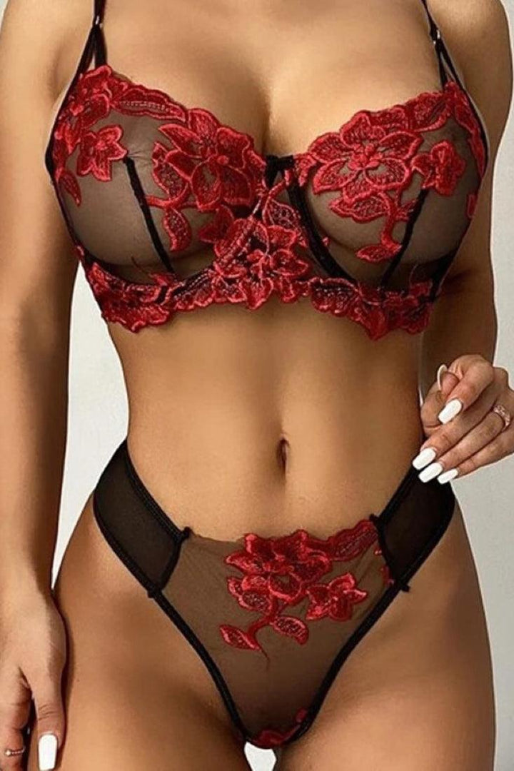 Red Floral Embroidered Underwire Bra & Panties Lingerie Set