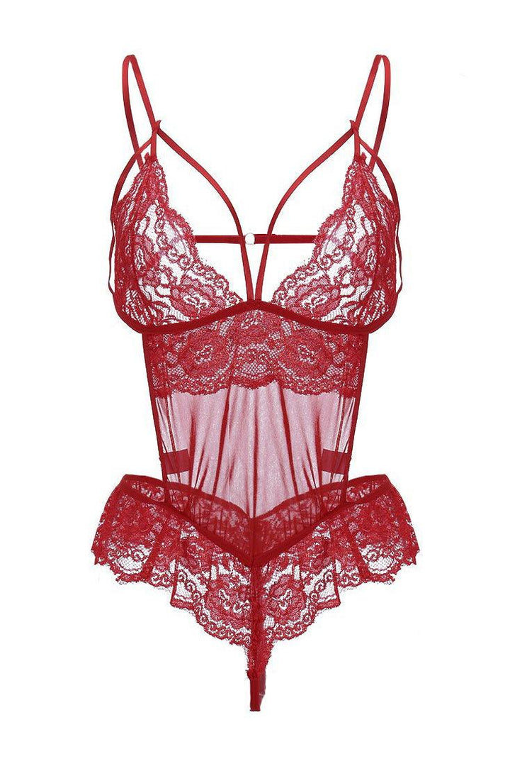 Red Deep V-Cut Sexy Cut Out Sheer Mesh Teddy Bodysuit