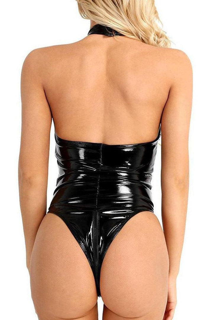 Black Faux Leather Netted Strappy Zipper Crotchless Sexy Lingerie
