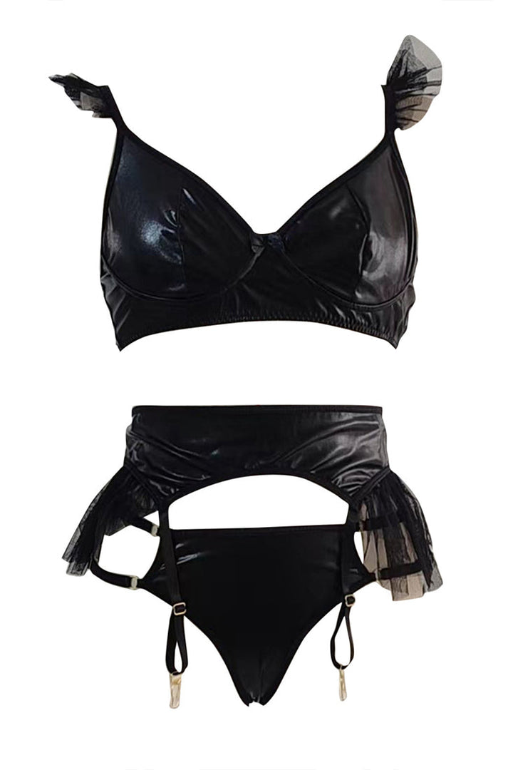 Black Faux Leather Ruffle Tulle 3pc Thong Lingerie Set