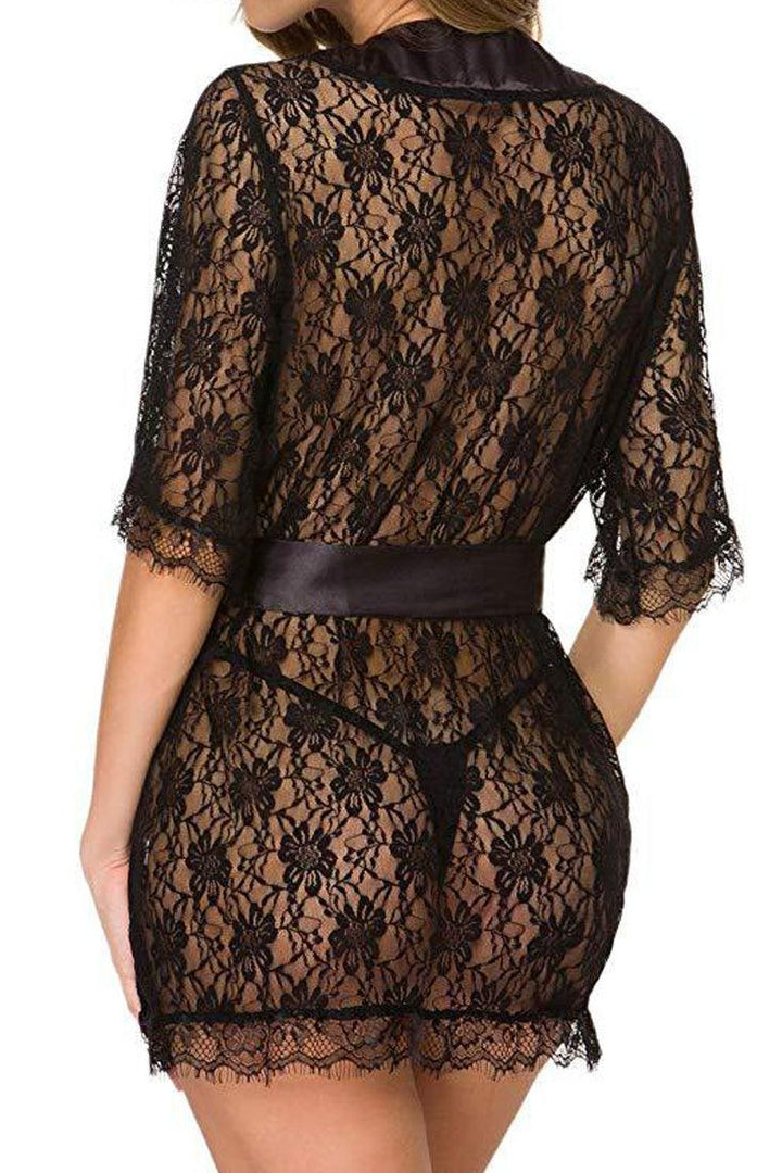 Black Floral Lace Mid Sleeve Lingerie Robe 3 Pc Set