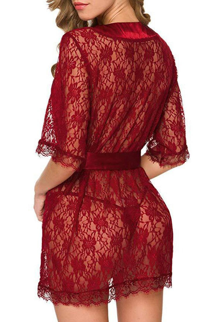 Wine Floral Lace Mid Sleeve Lingerie Robe 3 Pc Set