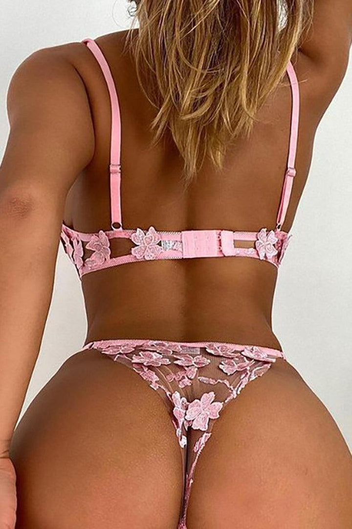Pink Sheer Mesh Floral Embroidered Underwire Bra & Panties Set