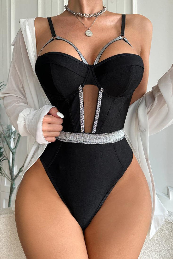 Black Silver Sparkly Strappy Mesh Cut-Out Thong Bodysuit Sexy Lingerie