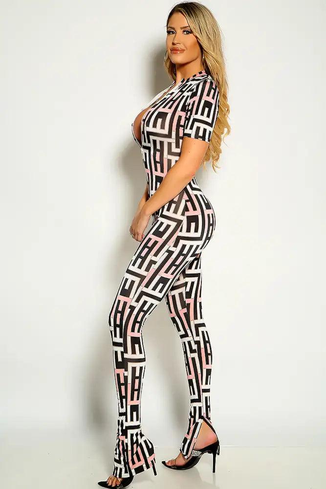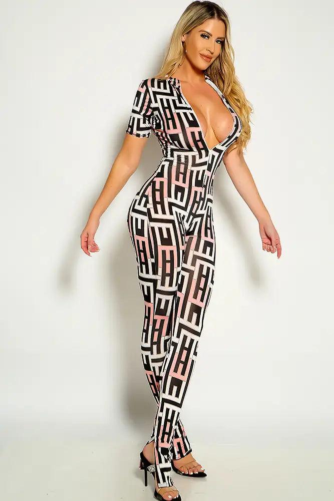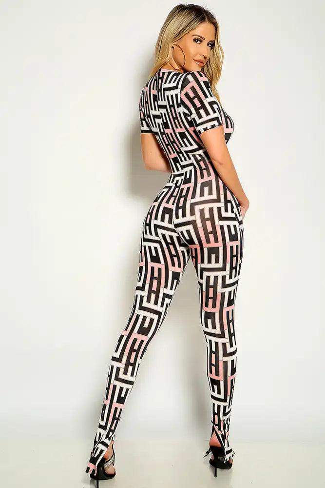 Pink White Black Short Sleeve Geometric Print Fitted Jumpsuit