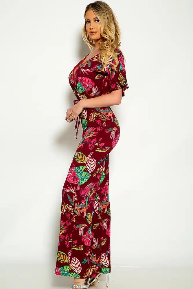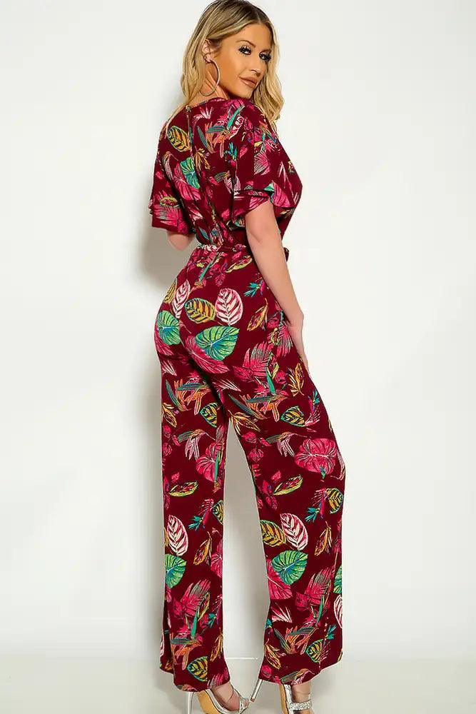 Wine Floral Short Sleeve Belted Flared Jumpsuit