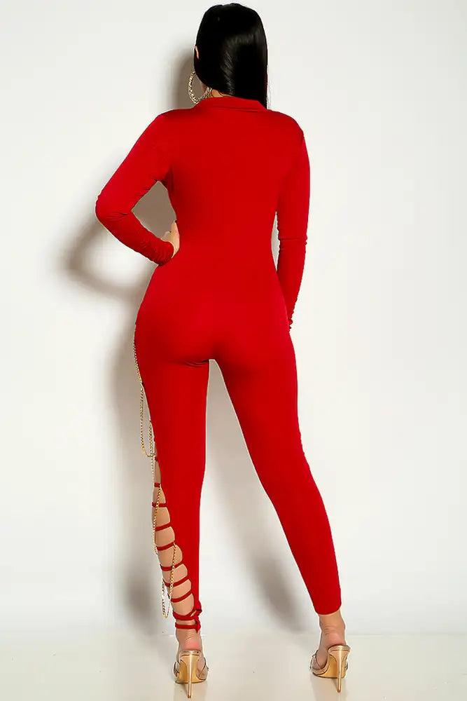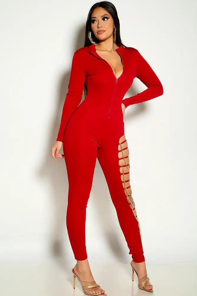 Wine Long Sleeve Strappy CHain Detail Sexy Jumpsuit